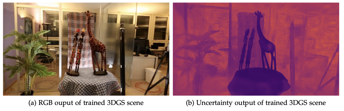 Qualitative results showing the rendered image from 3D Gaussian Splatting and corresponding uncertainty. Darker regions in the image exhibit lower uncertainty while brighter colors represent higher reconstruction uncertainty.